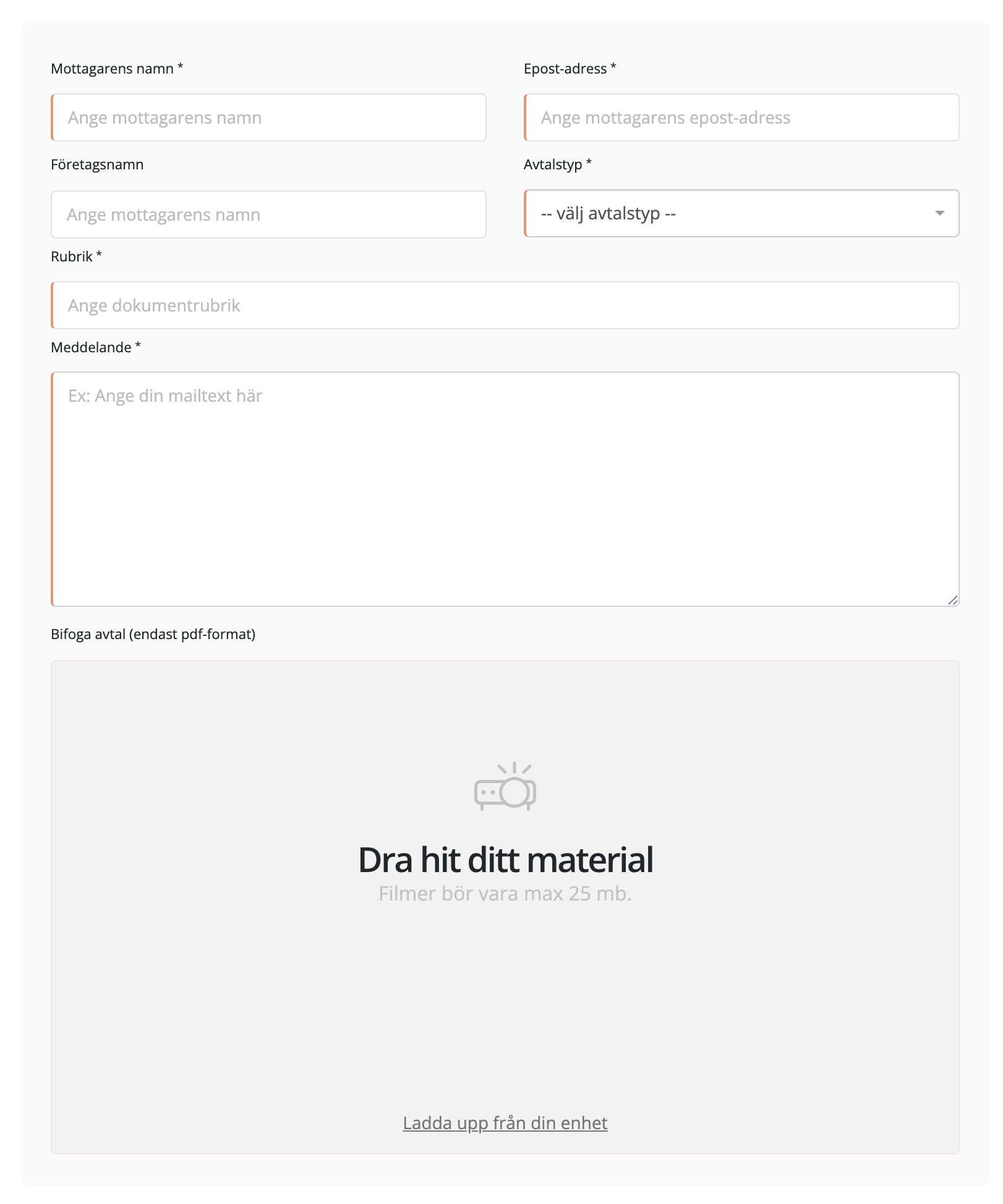 Bifoga avtal Klicka på fältet eller dra en pdf-fil som innehåller avtaletTänk på att bara ladda upp 1 pdf-dokument och inget annat format. Just nu stöder vi bara .pdf dokument