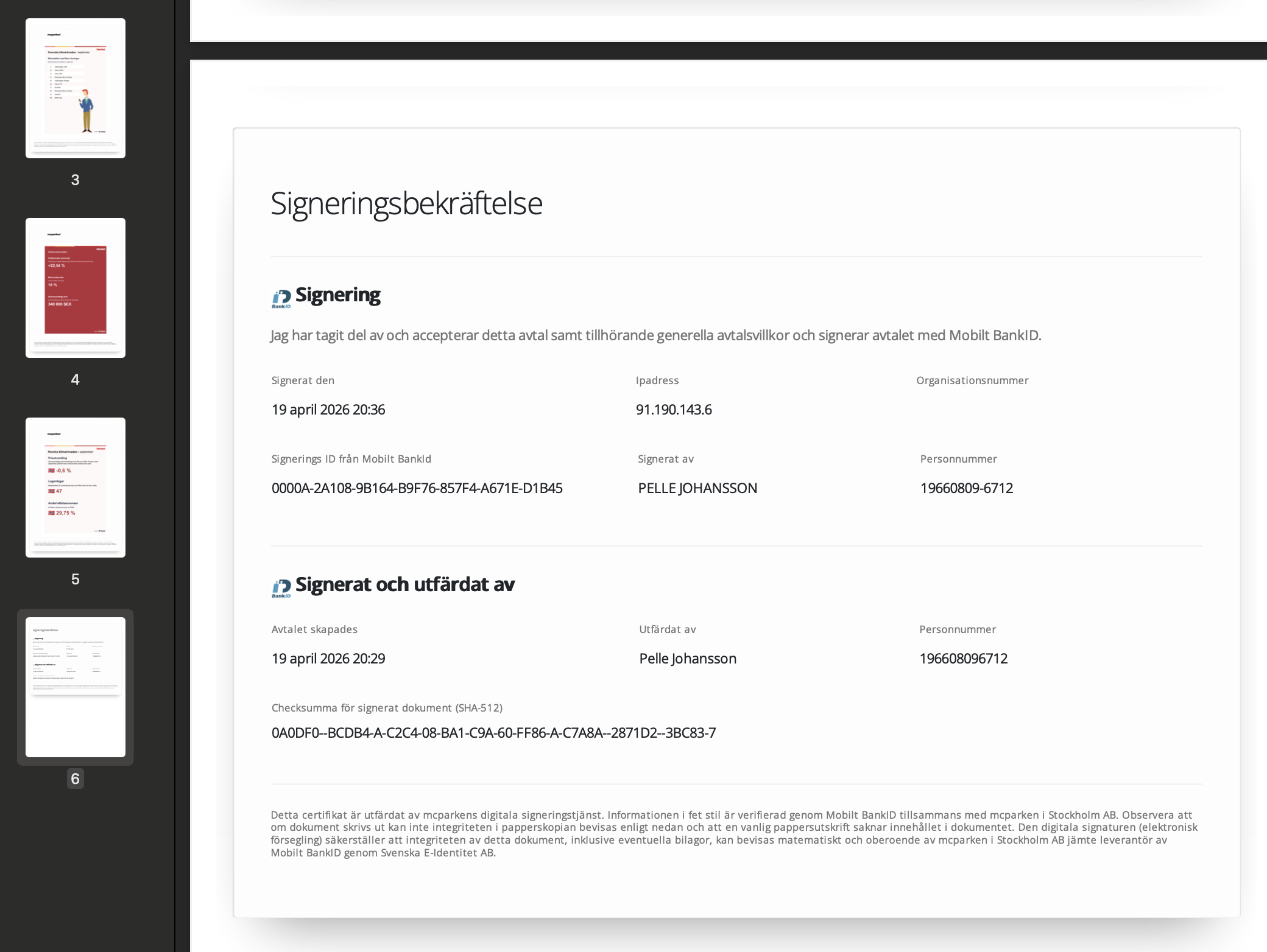 Det signerade avtalet kan se ut såhär. Nedan ser ni varje sida uppdelad i dokumentet samt sista sidan innehåller signeringen som ni kan se. Den nedre signeringen är från den som skickat ut avtalet. Den övre signeringen gäller den person som har signerat avtalet. Inbyggt i dokumentet finns en digital checksumma, kallat block-chain-teknik. Om detta pdf-dokument manipuleras så kommer inte checksumman matcha och avtalet är manipulerat. På så sätt säkerställer vi att dokumentet är ett original.