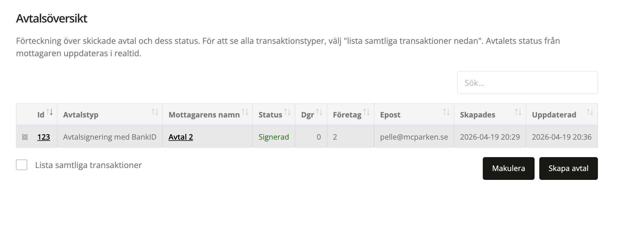 Två texter är klickbara. Dels ID och dels mottagarens namn. ID går till att se själva avtalet. Mottagarens namn visar de fält som ni fyllde i. Det går att makulera ett avtal genom att klicka någonstans på raden förutom de fält som är textlänkar. Ni kan markera ett eller flera fält samtidigt. När de är markerade så kan ni klicka på "makulera" för att ta bort ett avtal. Tänk på att det faktiskt raderas, så det är bättre att behålla det om ni behöver det framöver. För att skapa ett nytt avtal, klicka på knappen "Skapa avtal".