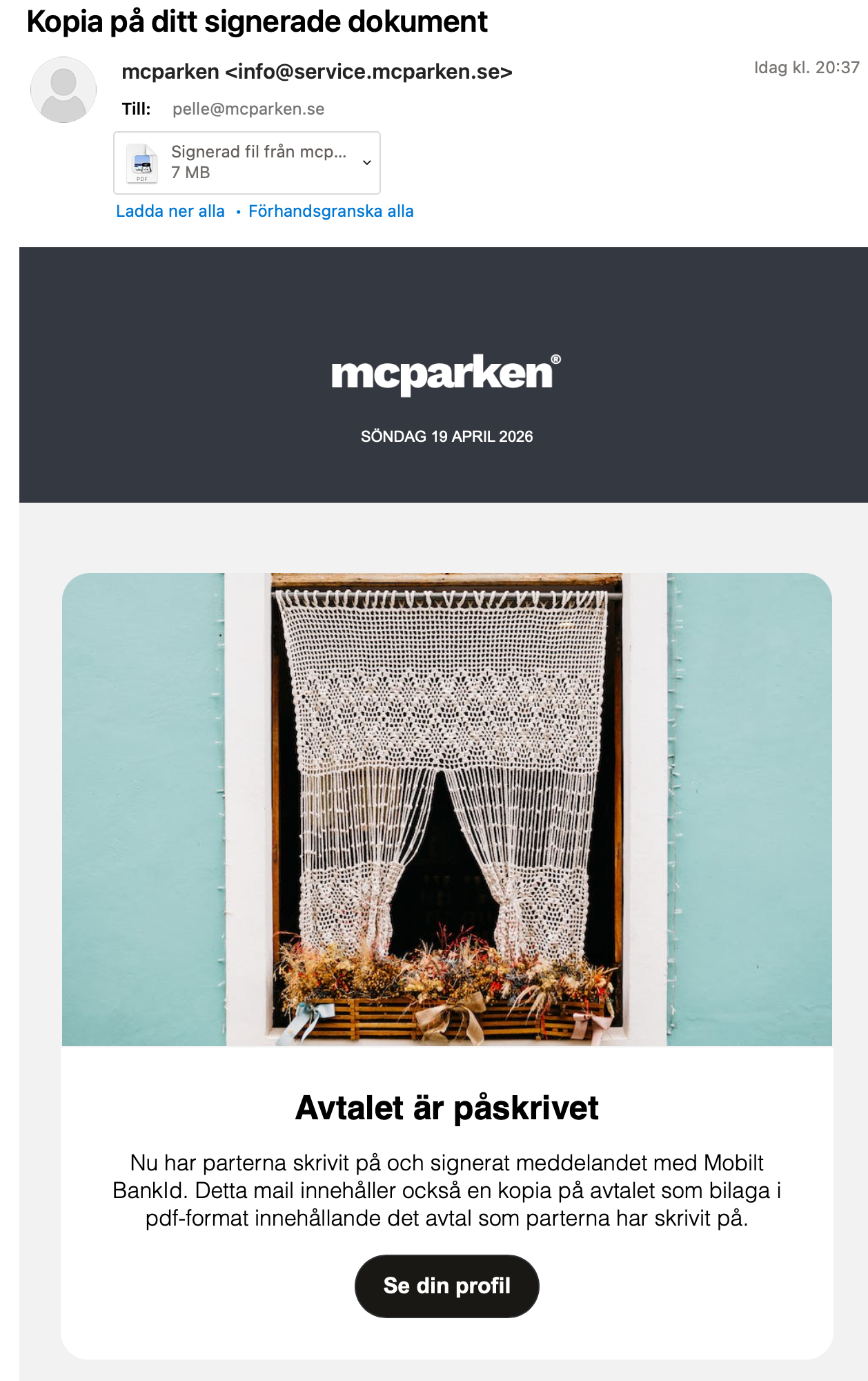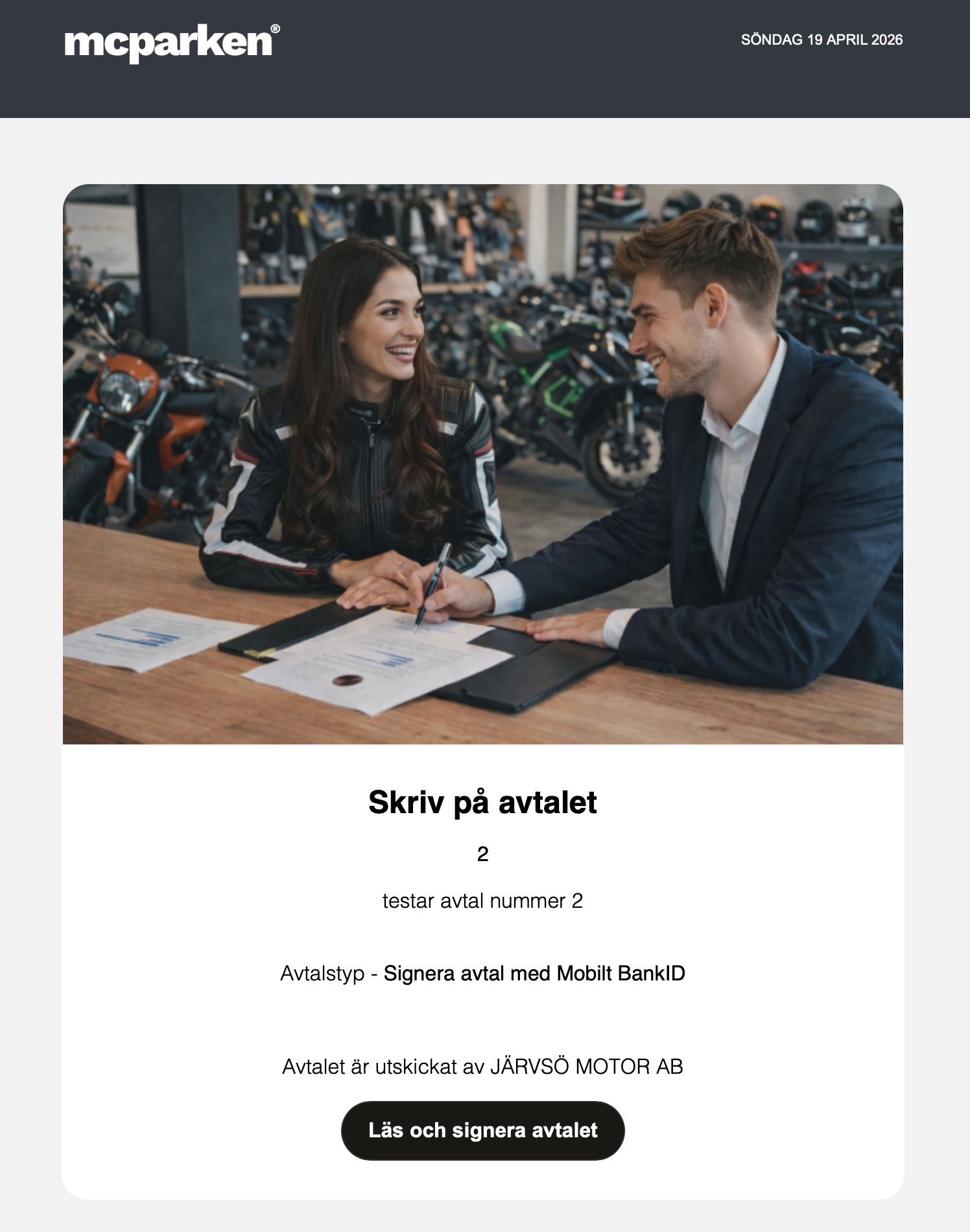 Obs! Informera gärna kunden att tjänsten är i samarbete med mcparken så de känner till avsändaren vid signeringen. Det bästa du kan göra är att be kunden bli medlem samtidigt för att enklare nå kunden med andra tjänster, meddelanden och möjlighet till merförsäljning i framtiden.